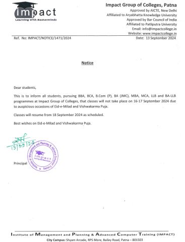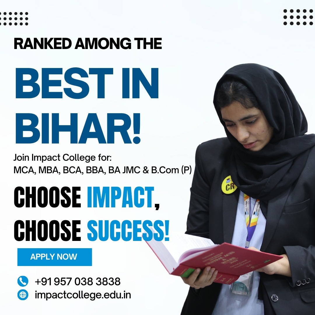 Impact Group of Colleges is a premier institution in Patna, offering excellence in higher education across various disciplines, including MCA, MBA, BCA, BBA, BA JMC, and B.COM. With a student-centric approach, industry-aligned curriculum, and experienced faculty, we are committed to nurturing future leaders. Our state-of-the-art infrastructure, innovative learning methods, and strong industry partnerships provide students with unparalleled opportunities for growth and success. Join Impact Group of Colleges and take the first step toward a bright and impactful future.
